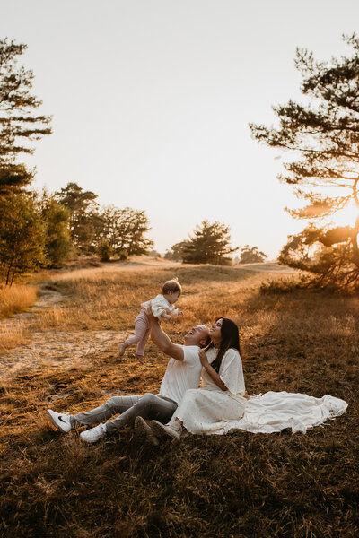 Goed om te weten; een shoot met golden hour valt in de zomermaanden erg laat op de avond. Voor kleine kindjes is een shoot in het voor- of najaar daarom mogelijk meer geschikt, de zonsondergang valt dan een stuk vroeger op de dag. Van december t/m februari shoot ik niet buiten met jonge kindjes. Door de kou valt er voor hun geen plezier aan te beleven en de rode neuzen, blauwe lippen en snottebellen maken het er vaak ook niet mooier op ;-)